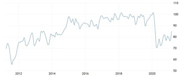 Graf týdne: Spotřebitelská důvěra v USA roste, stále však má co dohánět, zdroj: tradingeconomics.com